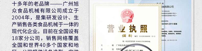 廣州旭眾食品機械有限公司是一家集科研開發(fā),生產設計,營銷服務為一體的現(xiàn)代化生產企業(yè)?,F(xiàn)代化生產車間,精湛制造技術,所產機械歷經市場重重考驗,不斷贏得海內外客戶的贊譽。