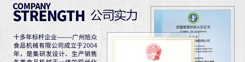 廣州旭眾食品機(jī)械有限公司是一家集科研開發(fā),生產(chǎn)設(shè)計(jì),營(yíng)銷服務(wù)為一體的現(xiàn)代化生產(chǎn)企業(yè)。現(xiàn)代化生產(chǎn)車間,精湛制造技術(shù),所產(chǎn)機(jī)械歷經(jīng)市場(chǎng)重重考驗(yàn),不斷贏得海內(nèi)外客戶的贊譽(yù)。