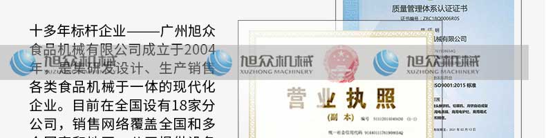 廣州旭眾食品機械有限公司是一家集科研開發(fā),生產(chǎn)設計,營銷服務為一體的現(xiàn)代化生產(chǎn)企業(yè)?,F(xiàn)代化生產(chǎn)車間,精湛制造技術(shù),所產(chǎn)機械歷經(jīng)市場重重考驗,不斷贏得海內(nèi)外客戶的贊譽。