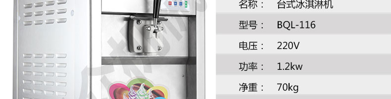 BQL-116臺式冰淇淋機,●選用國際名牌成熟制冷配套件和高效壓縮機,融合旭眾精湛工藝輔以嚴格的質(zhì)量控制流程,使產(chǎn)品整體性能及品質(zhì)得以全面提升。●采用全數(shù)字電腦控制系統(tǒng),選用名牌優(yōu)質(zhì)電器元件,先進的生產(chǎn)工藝,故障診斷,軟硬任意調(diào)制,自動修復(fù)功能,安全精確,可靠性更高?!駥I(yè)成熟制冷系統(tǒng)設(shè)計,選用世界名牌大功率專用壓縮機,大大縮短冰淇淋成型時間,相同時間內(nèi)冰淇淋產(chǎn)量大幅度增加,使您生意火爆時依然得心應(yīng)手,為您創(chuàng)造財富?!癜踩椒€(wěn)的機械攪拌系統(tǒng),噪音更低、振動更小,使整機運行性能達到國際先進水平?!翊_保進料溫度在0°C~35°C;環(huán)境溫度5°C~40°C勻可正常使用。