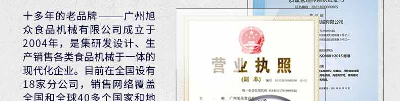 廣州旭眾食品機械有限公司是一家集科研開發(fā),生產(chǎn)設(shè)計,營銷服務(wù)為一體的現(xiàn)代化生產(chǎn)企業(yè)?,F(xiàn)代化生產(chǎn)車間,精湛制造技術(shù),所產(chǎn)機械歷經(jīng)市場重重考驗,不斷贏得海內(nèi)外客戶的贊譽。