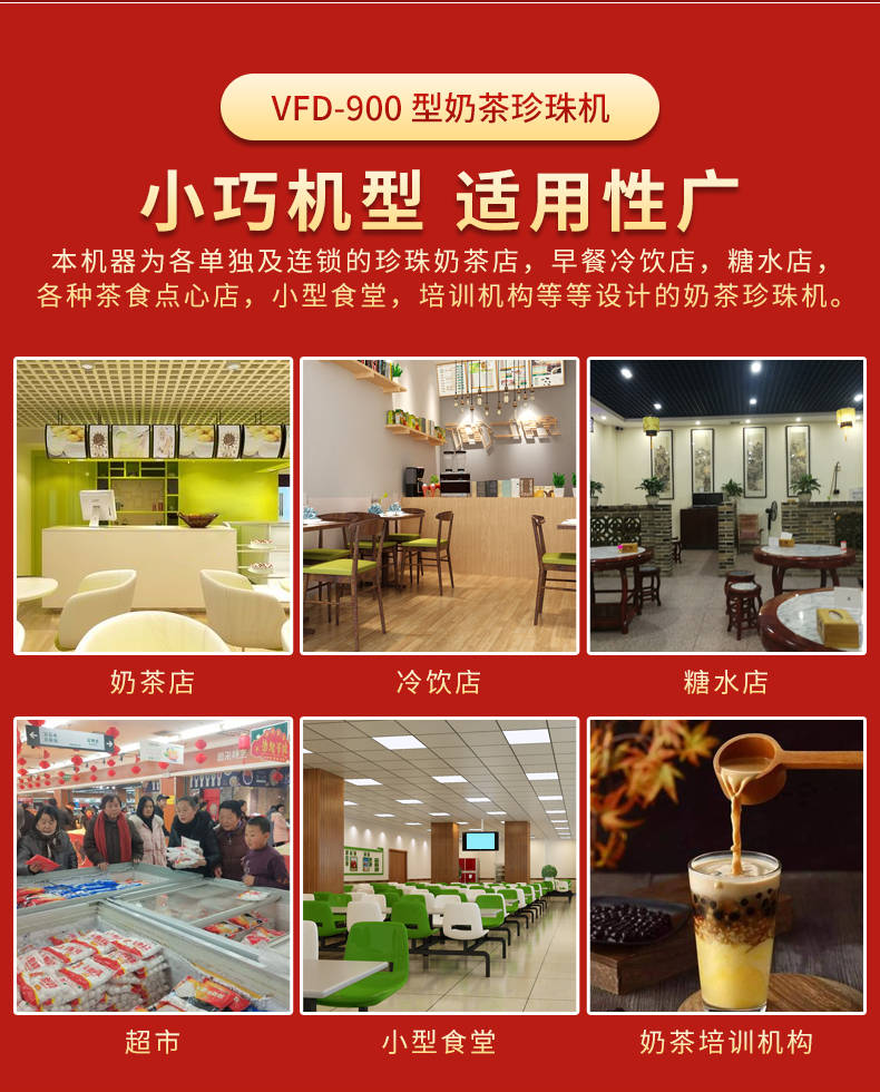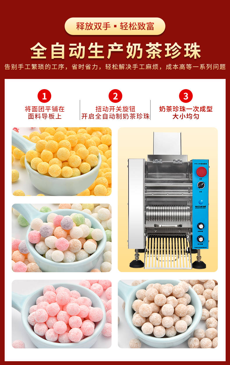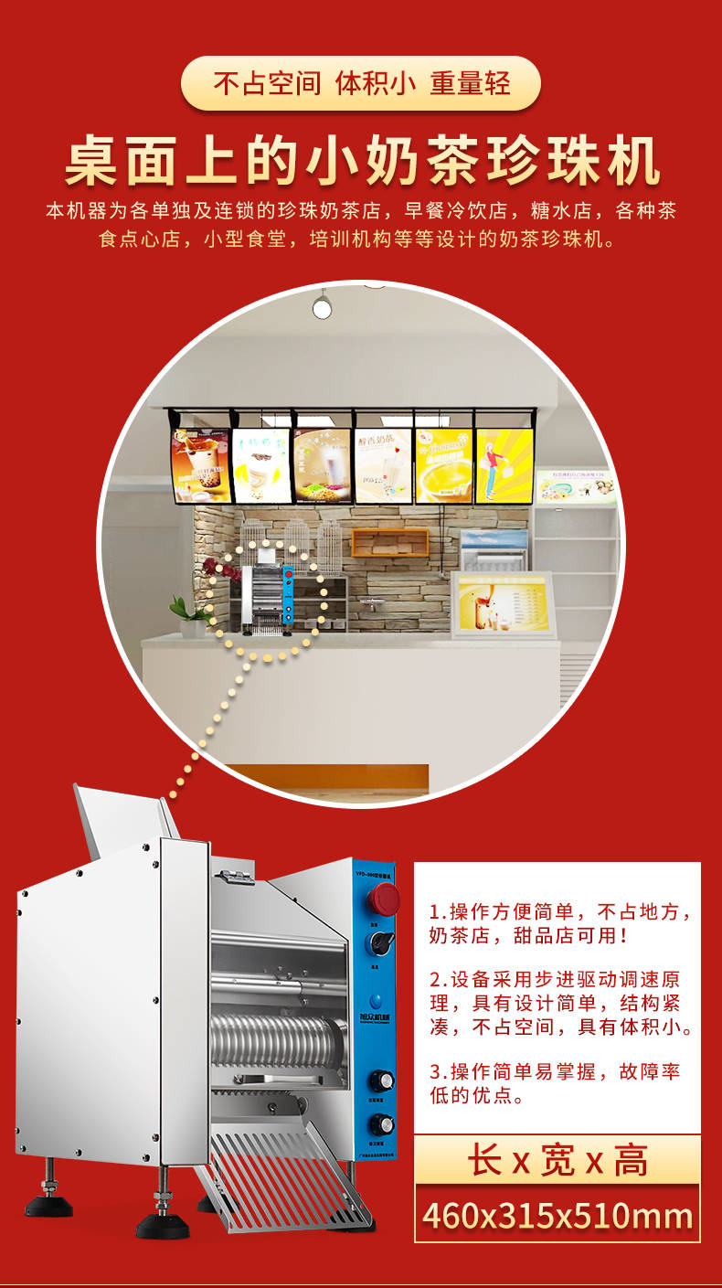 VFD-900珍珠奶茶機(jī),奶茶店、甜品店可用。可生產(chǎn)奶茶珍珠,果蔬圓子,無餡湯圓,水晶湯圓,各種芋圓。不占空間、體積小、重量輕,桌面上的小奶茶珍珠機(jī)。告別手工繁瑣的工序,省時(shí)省力,輕松解決手工麻煩,成本高等一系列問題