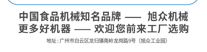 廣州旭眾食品機械有限公司是一家集科研開發(fā),生產設計,營銷服務為一體的現(xiàn)代化生產企業(yè)?,F(xiàn)代化生產車間,精湛制造技術,所產機械歷經市場重重考驗,不斷贏得海內外客戶的贊譽。