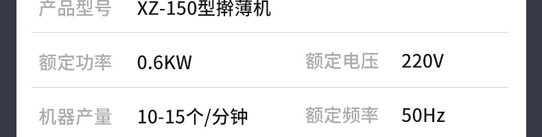 XZ-150型搟薄機,為一種對面團可進行氣動拍餅或仿手工搟薄的設(shè)備,可根據(jù)用戶需要對面團的直徑、厚度進行調(diào)整并將面團按照設(shè)定的規(guī)格進行搓圓摔搟薄。