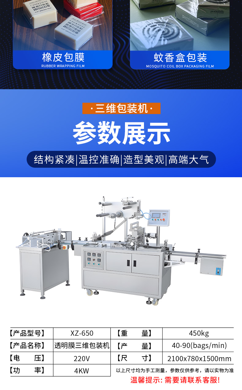 XZ-650包裝機,三維包裝機,全自動化操作出膜、切膜、包膜、熱封一次完成??蓮V泛應(yīng)用多種產(chǎn)品,適用包裝的產(chǎn)品有食品、撲克牌、香煙盒化妝品、日用品、文具用品等類型產(chǎn)品。