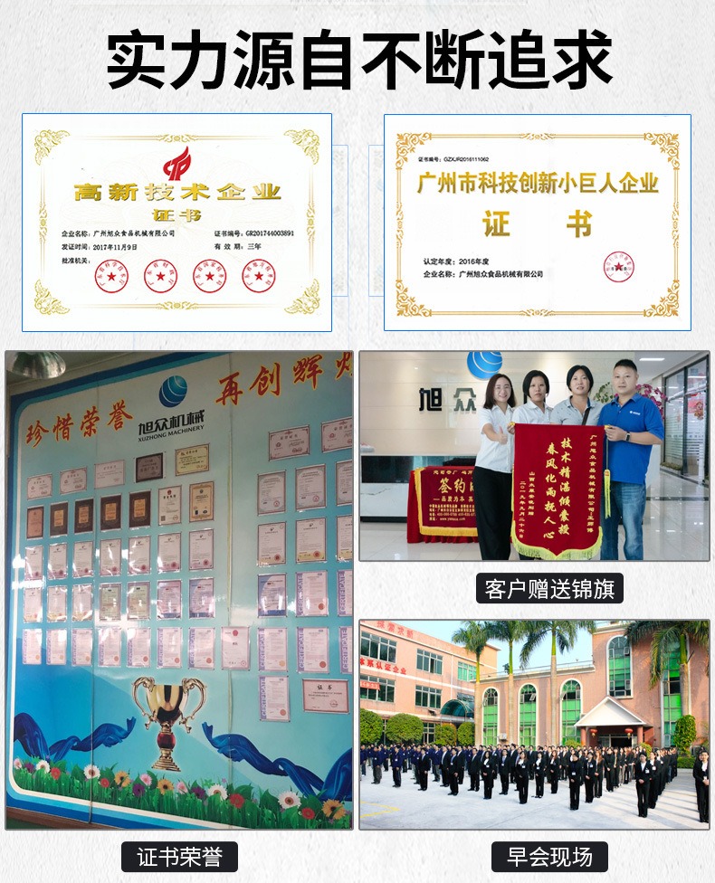廣州旭眾食品機械有限公司是一家集科研開發(fā),生產(chǎn)設(shè)計,營銷服務(wù)為一體的現(xiàn)代化生產(chǎn)企業(yè)?,F(xiàn)代化生產(chǎn)車間,精湛制造技術(shù),所產(chǎn)機械歷經(jīng)市場重重考驗,不斷贏得海內(nèi)外客戶的贊譽。