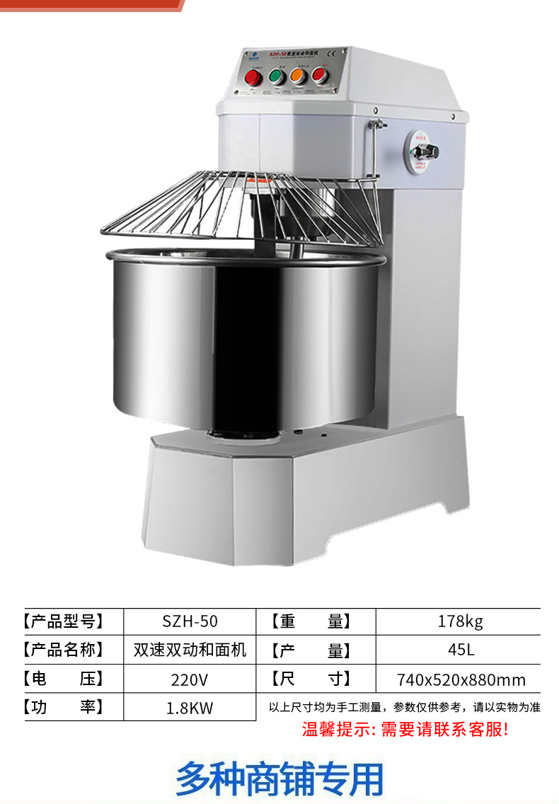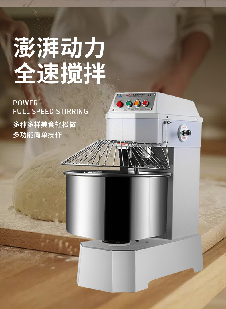 SZH-50型雙速雙動和面機,本機適合攪拌各種面包、包子、饅頭、湯圓、披薩餅面團,專業(yè)設計避免面團過分升溫并確保面團含氧量。過載、缺相保護裝置,防護罩安全連動裝置。