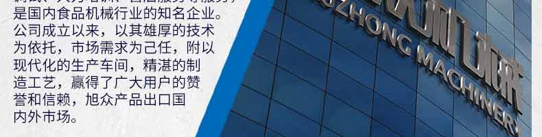 廣州旭眾食品機(jī)械有限公司是一家集科研開(kāi)發(fā),生產(chǎn)設(shè)計(jì),營(yíng)銷服務(wù)為一體的現(xiàn)代化生產(chǎn)企業(yè)?,F(xiàn)代化生產(chǎn)車間,精湛制造技術(shù),所產(chǎn)機(jī)械歷經(jīng)市場(chǎng)重重考驗(yàn),不斷贏得海內(nèi)外客戶的贊譽(yù)。