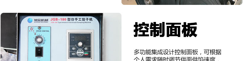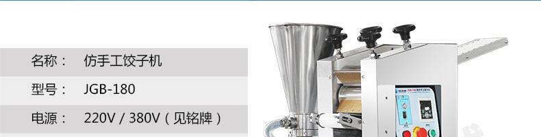 JGB-180餃子機,先進的自動餃子生產(chǎn)設備,包括主動壓皮部分、自動供餡部分、自動包合部分、自動成品輸送部分,并且只要更換模具,就可制鍋貼等食品。適合食品速凍廠、飯店、廠礦學校食堂等制作包餡面制品單位使用。