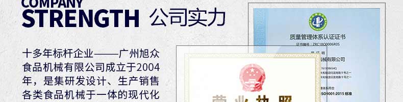 廣州旭眾食品機(jī)械有限公司是一家集科研開(kāi)發(fā),生產(chǎn)設(shè)計(jì),營(yíng)銷服務(wù)為一體的現(xiàn)代化生產(chǎn)企業(yè)?,F(xiàn)代化生產(chǎn)車間,精湛制造技術(shù),所產(chǎn)機(jī)械歷經(jīng)市場(chǎng)重重考驗(yàn),不斷贏得海內(nèi)外客戶的贊譽(yù)。