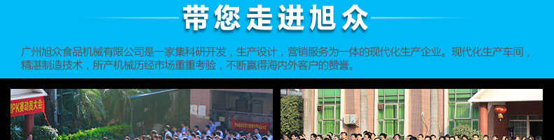 廣州旭眾食品機械有限公司是一家集科研開發(fā),生產(chǎn)設(shè)計,營銷服務(wù)為一體的現(xiàn)代化生產(chǎn)企業(yè)?,F(xiàn)代化生產(chǎn)車間,精湛制造技術(shù),所產(chǎn)機械歷經(jīng)市場重重考驗,不斷贏得海內(nèi)外客戶的贊譽。