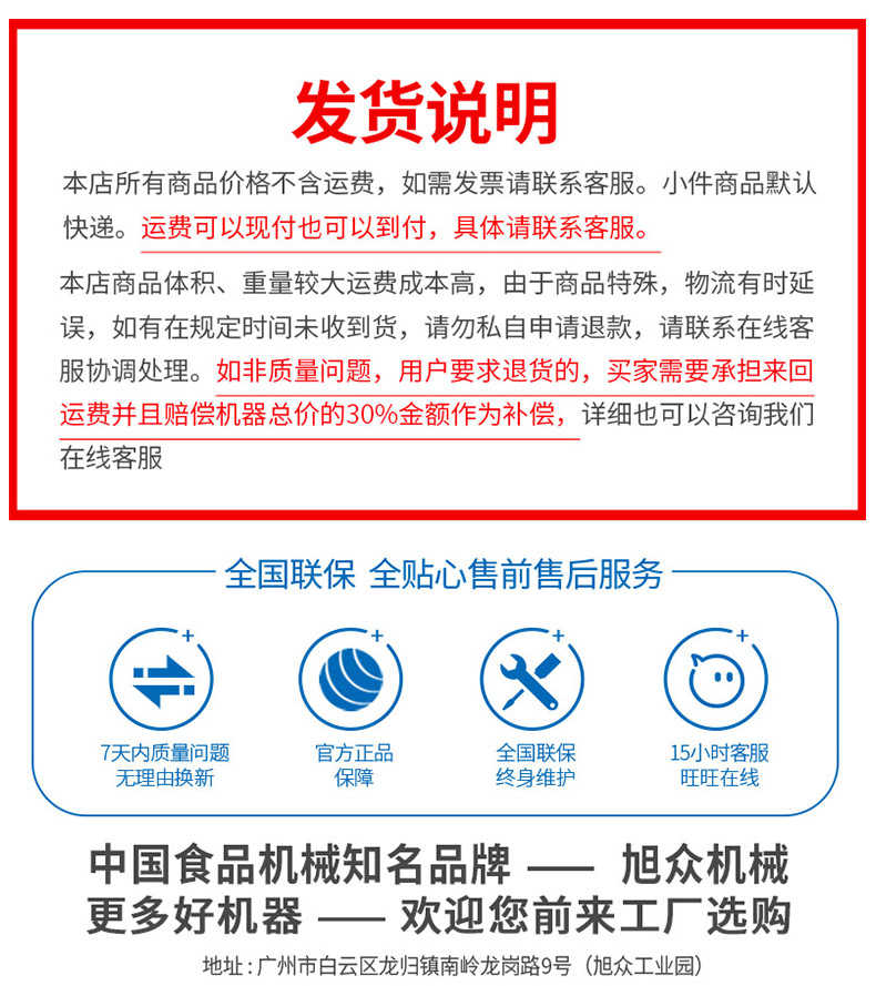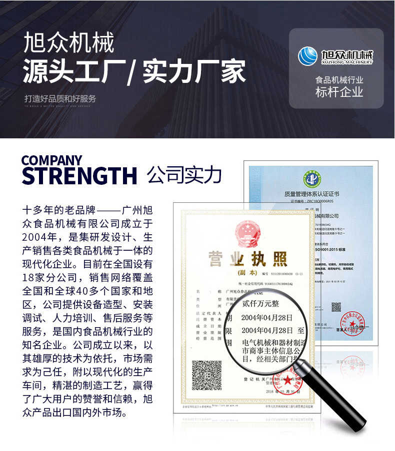 廣州旭眾食品機(jī)械有限公司是一家集科研開(kāi)發(fā),生產(chǎn)設(shè)計(jì),營(yíng)銷(xiāo)服務(wù)為一體的現(xiàn)代化生產(chǎn)企業(yè)?,F(xiàn)代化生產(chǎn)車(chē)間,精湛制造技術(shù),所產(chǎn)機(jī)械歷經(jīng)市場(chǎng)重重考驗(yàn),不斷贏得海內(nèi)外客戶(hù)的贊譽(yù)。