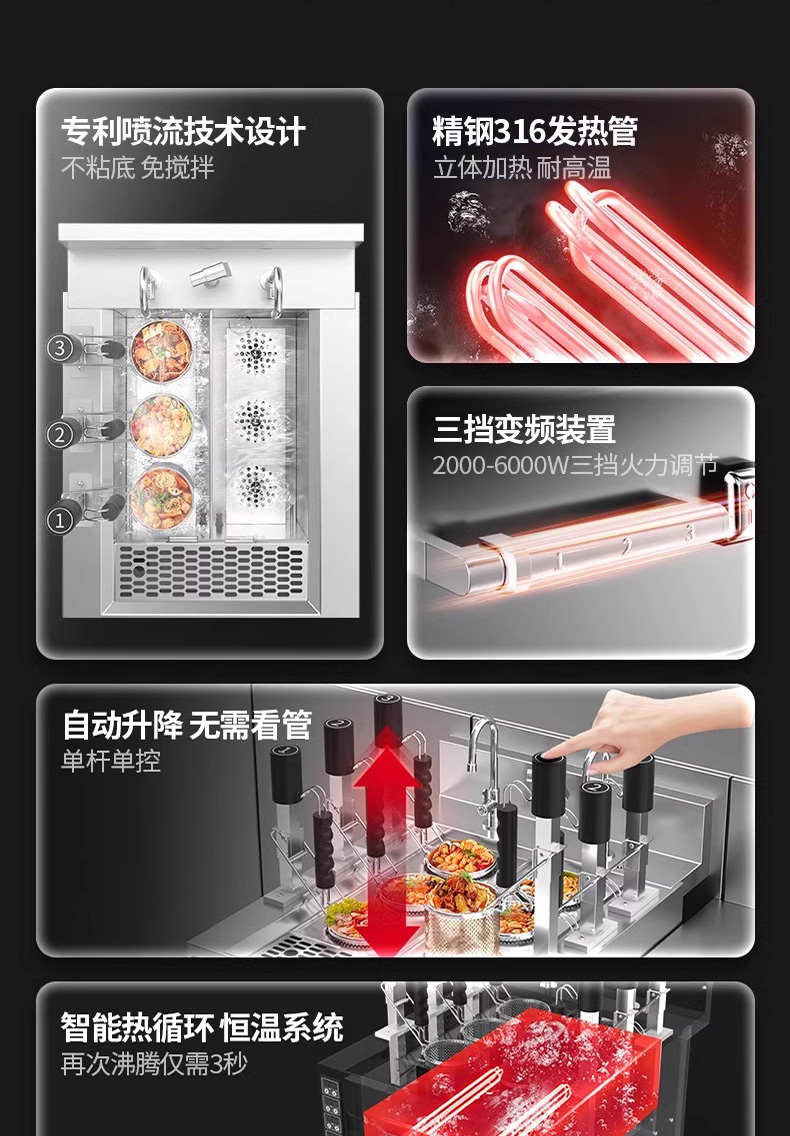 三合一煮面爐,全新升級,自動(dòng)升降再次沸騰,僅需3秒。316精鋼加粗發(fā)熱管、升級噴流技術(shù)、低功耗變頻技術(shù)。煮面爐三合一升級,沸騰沖浪、變頻節(jié)能。