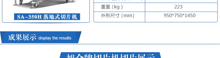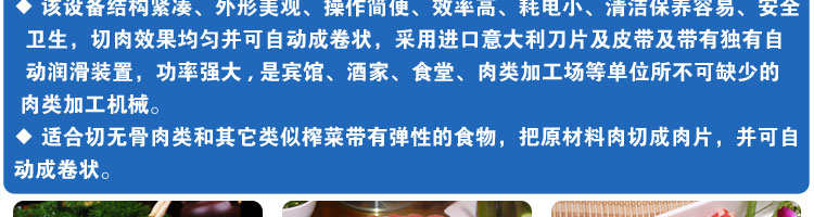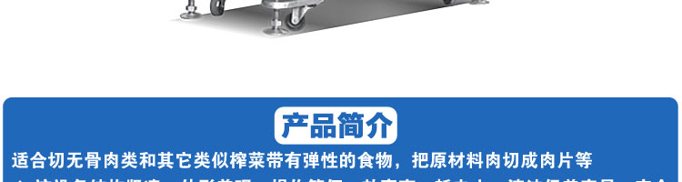 SA-350H 全自動(dòng)落地式切片機(jī),適合切無(wú)骨肉類(lèi)和其他類(lèi)似榨菜帶有彈性的食物,把原材料肉切成肉片,并可自動(dòng)成卷狀??汕信H馄⒀蛉馄?/p>