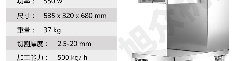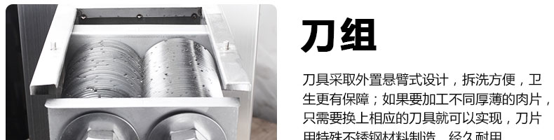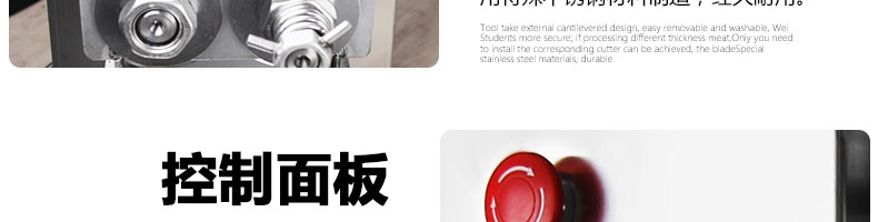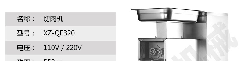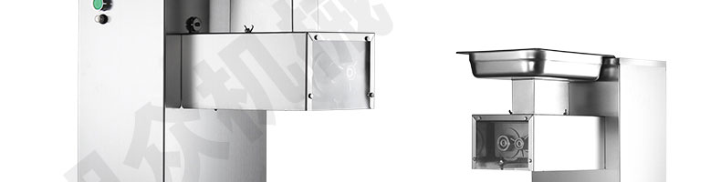 XZ-QE切肉機(jī),是一款可方便移動(dòng)的肉類加工設(shè)備,配置單層刀具一次性切肉片,二次切肉絲,再切成粒。底座設(shè)置有滑輪,移動(dòng)靈活,輕松便捷;刀具采取外置懸臂式設(shè)計(jì),拆洗方便,衛(wèi)生更有保障;配置多種刀具,可加工不同厚度的肉片,實(shí)現(xiàn)一機(jī)多用;機(jī)內(nèi)裝有安全保護(hù)開(kāi)頭,刀具外露時(shí),機(jī)器自鎖不能啟動(dòng),以保安全;刀片用特殊不銹鋼材料制造,經(jīng)久耐用;卸下的刀具,不用清洗直接放置在6攝氏度以下的冰箱里,刀具余肉不發(fā)臭。