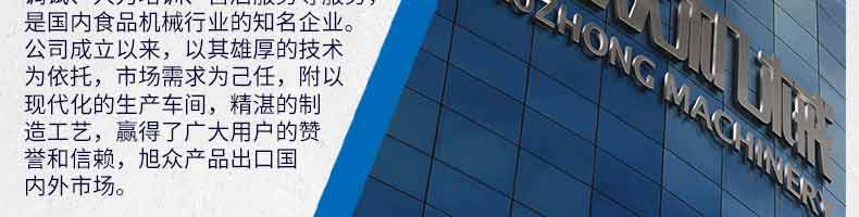 廣州旭眾食品機(jī)械有限公司是一家集科研開發(fā),生產(chǎn)設(shè)計,營銷服務(wù)為一體的現(xiàn)代化生產(chǎn)企業(yè)。現(xiàn)代化生產(chǎn)車間,精湛制造技術(shù),所產(chǎn)機(jī)械歷經(jīng)市場重重考驗(yàn),不斷贏得海內(nèi)外客戶的贊譽(yù)。