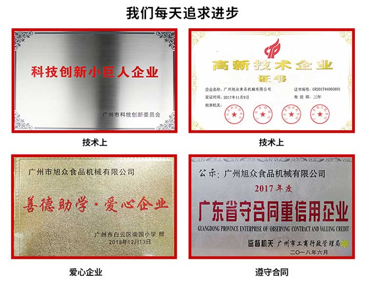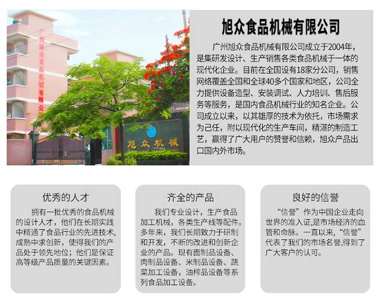 廣州旭眾食品機(jī)械有限公司是一家集科研開發(fā),生產(chǎn)設(shè)計(jì),營銷服務(wù)為一體的現(xiàn)代化生產(chǎn)企業(yè)?,F(xiàn)代化生產(chǎn)車間,精湛制造技術(shù),所產(chǎn)機(jī)械歷經(jīng)市場(chǎng)重重考驗(yàn),不斷贏得海內(nèi)外客戶的贊譽(yù)。