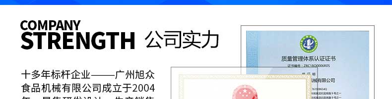 廣州旭眾食品機(jī)械有限公司是一家集科研開發(fā),生產(chǎn)設(shè)計(jì),營(yíng)銷服務(wù)為一體的現(xiàn)代化生產(chǎn)企業(yè)?,F(xiàn)代化生產(chǎn)車間,精湛制造技術(shù),所產(chǎn)機(jī)械歷經(jīng)市場(chǎng)重重考驗(yàn),不斷贏得海內(nèi)外客戶的贊譽(yù)。