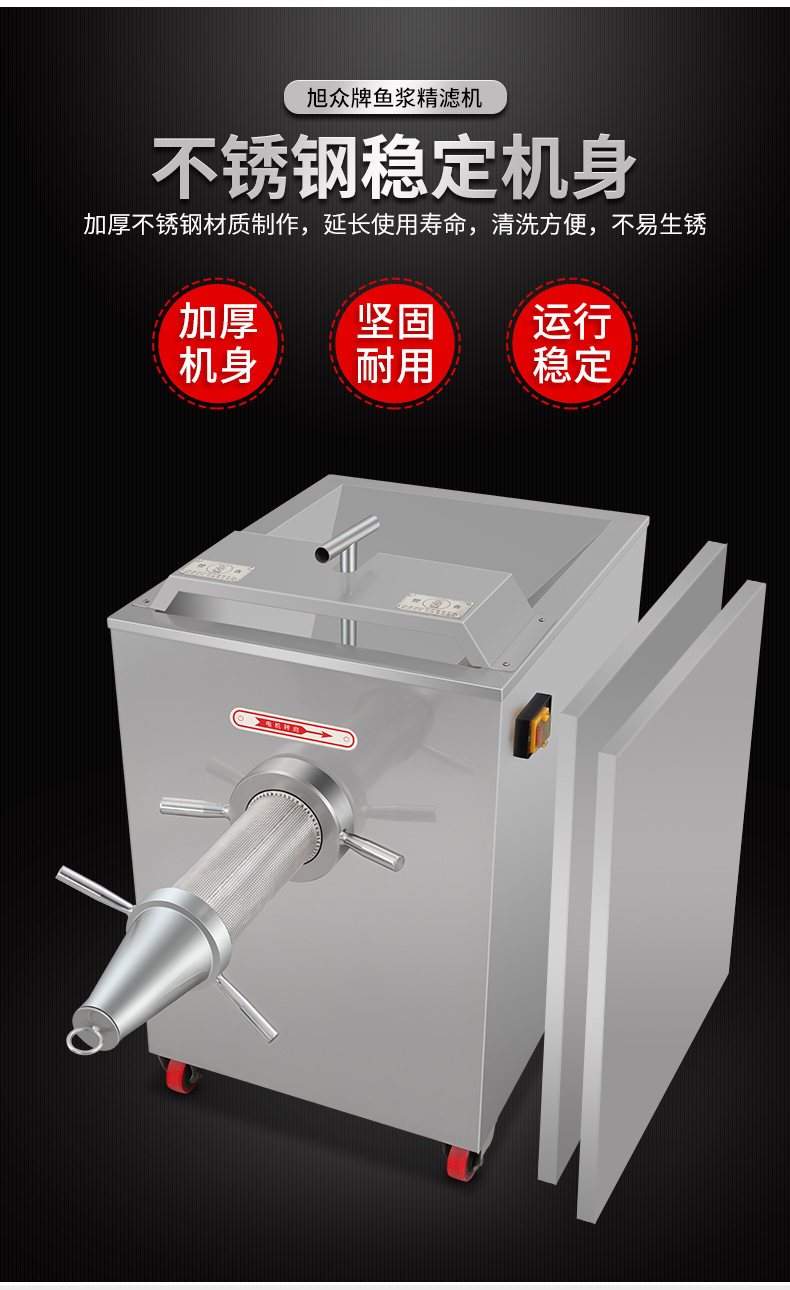 SZJ-300魚漿精濾機,商用創(chuàng)業(yè)魚漿精濾機,用于配套魚肉采肉機進行魚肉過濾雜質。節(jié)省人工開支,人工加工魚漿,效率慢剔除魚細骨,不干凈,有了魚漿精濾機,一人就可以很快制作多種魚漿。