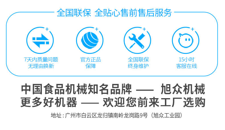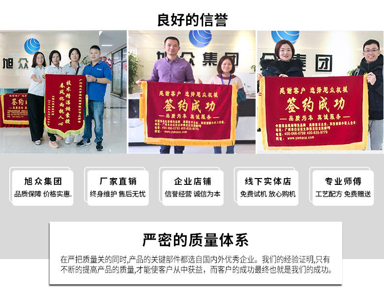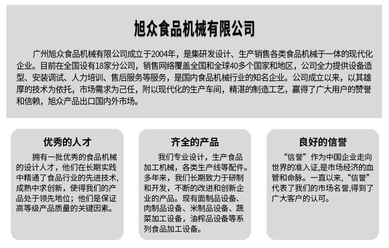 廣州旭眾食品機(jī)械有限公司是一家集科研開發(fā),生產(chǎn)設(shè)計(jì),營銷服務(wù)為一體的現(xiàn)代化生產(chǎn)企業(yè)。現(xiàn)代化生產(chǎn)車間,精湛制造技術(shù),所產(chǎn)機(jī)械歷經(jīng)市場重重考驗(yàn),不斷贏得海內(nèi)外客戶的贊譽(yù)。